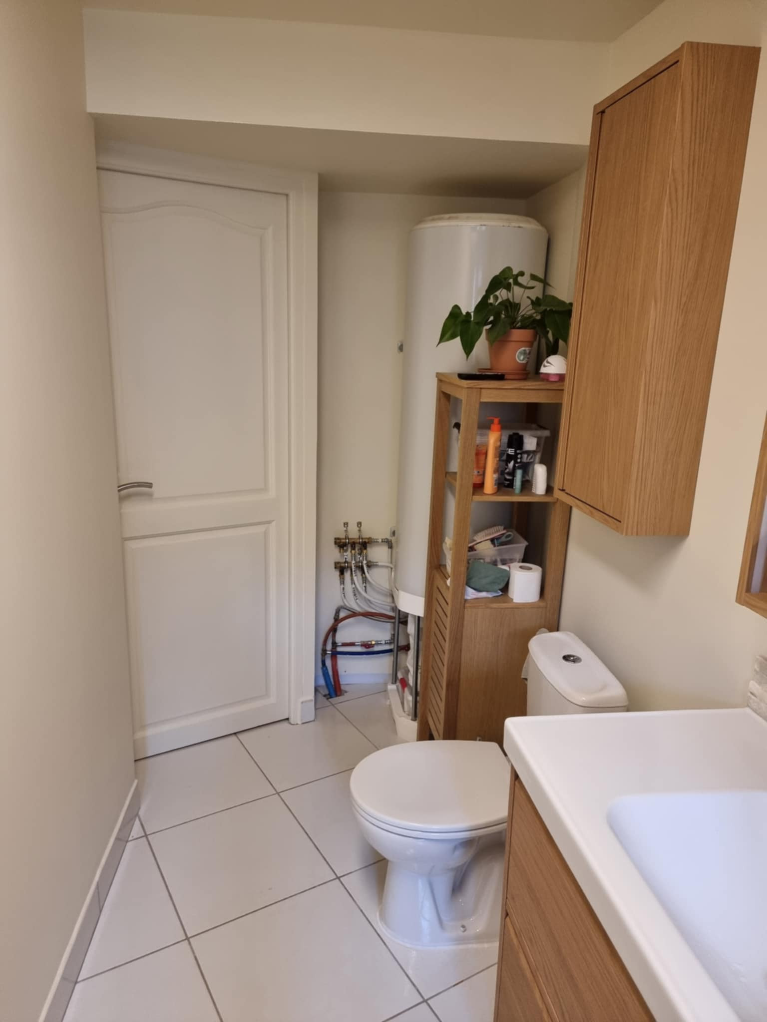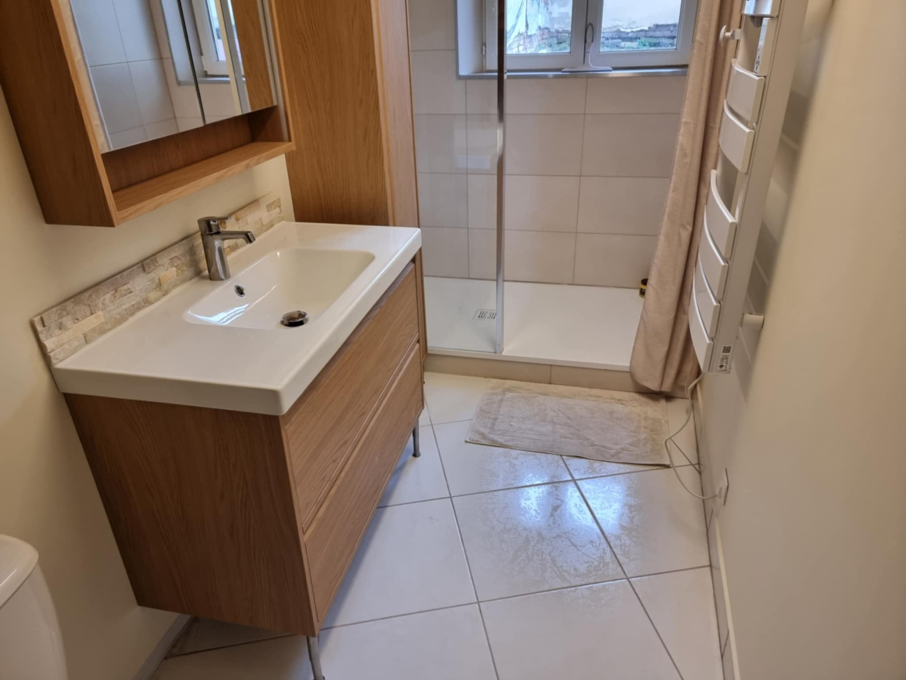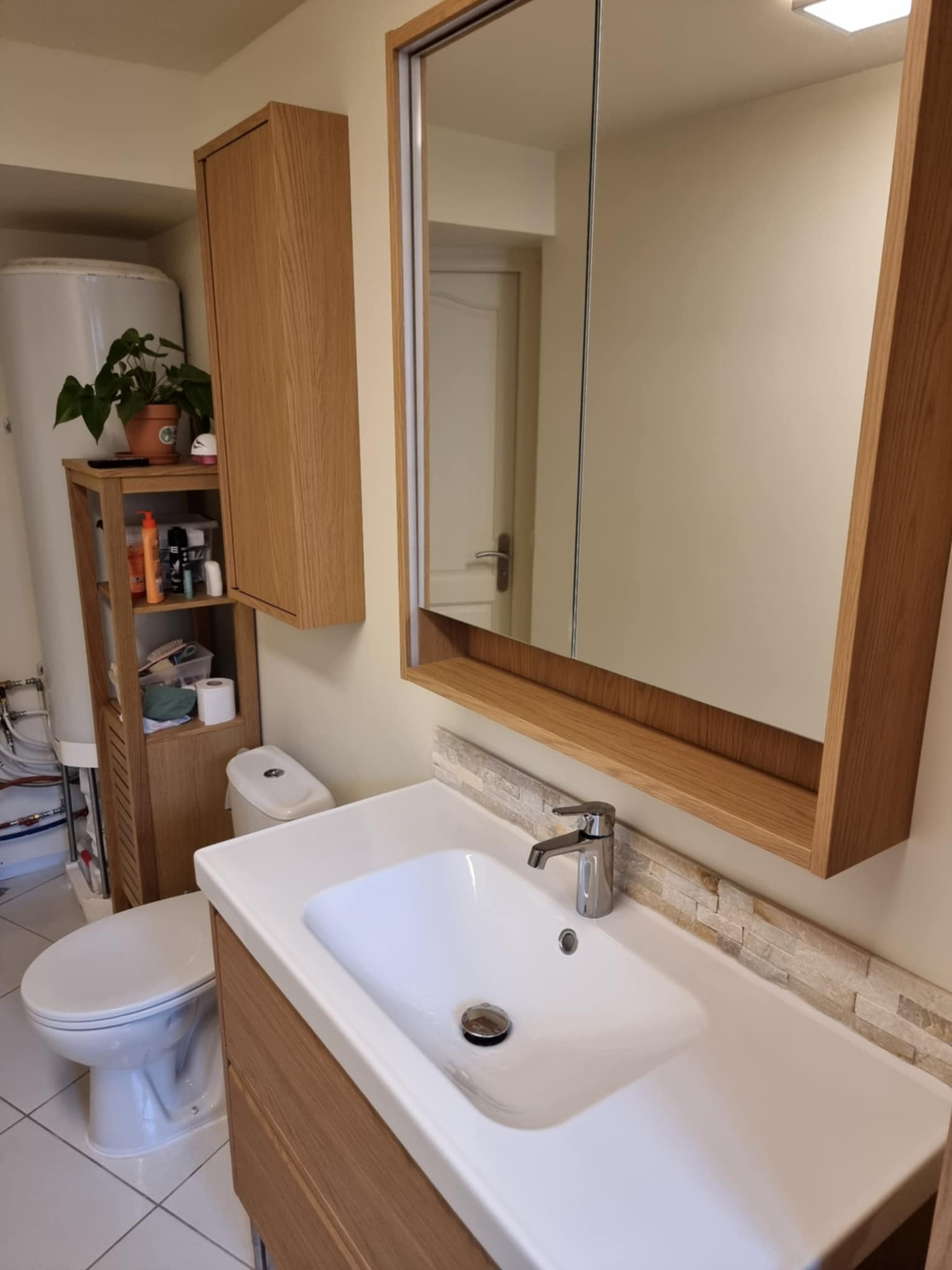 Pour finaliser la rénovation, CM Rénovation a également procédé à la pose du mobilier de salle de bain, incluant les éléments indispensables au confort quotidien : meuble vasque, rangements et équipements sanitaires.