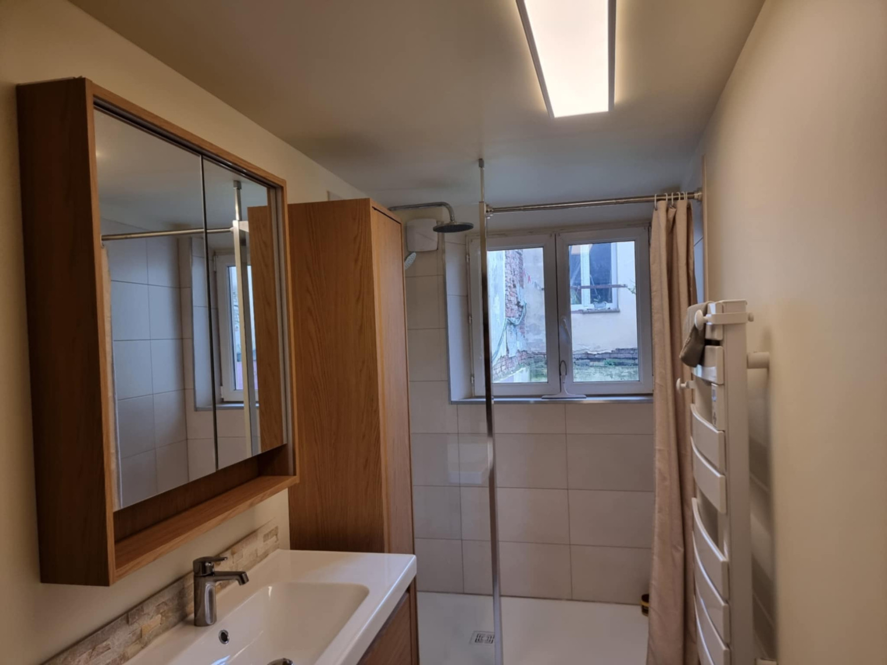 L’ancienne baignoire a été retirée afin de laisser place à un receveur de douche moderne, offrant un accès plus pratique et une utilisation quotidienne plus confortable. Ce type d’aménagement est aujourd’hui très recherché lors des rénovations de salle de bain, notamment pour :