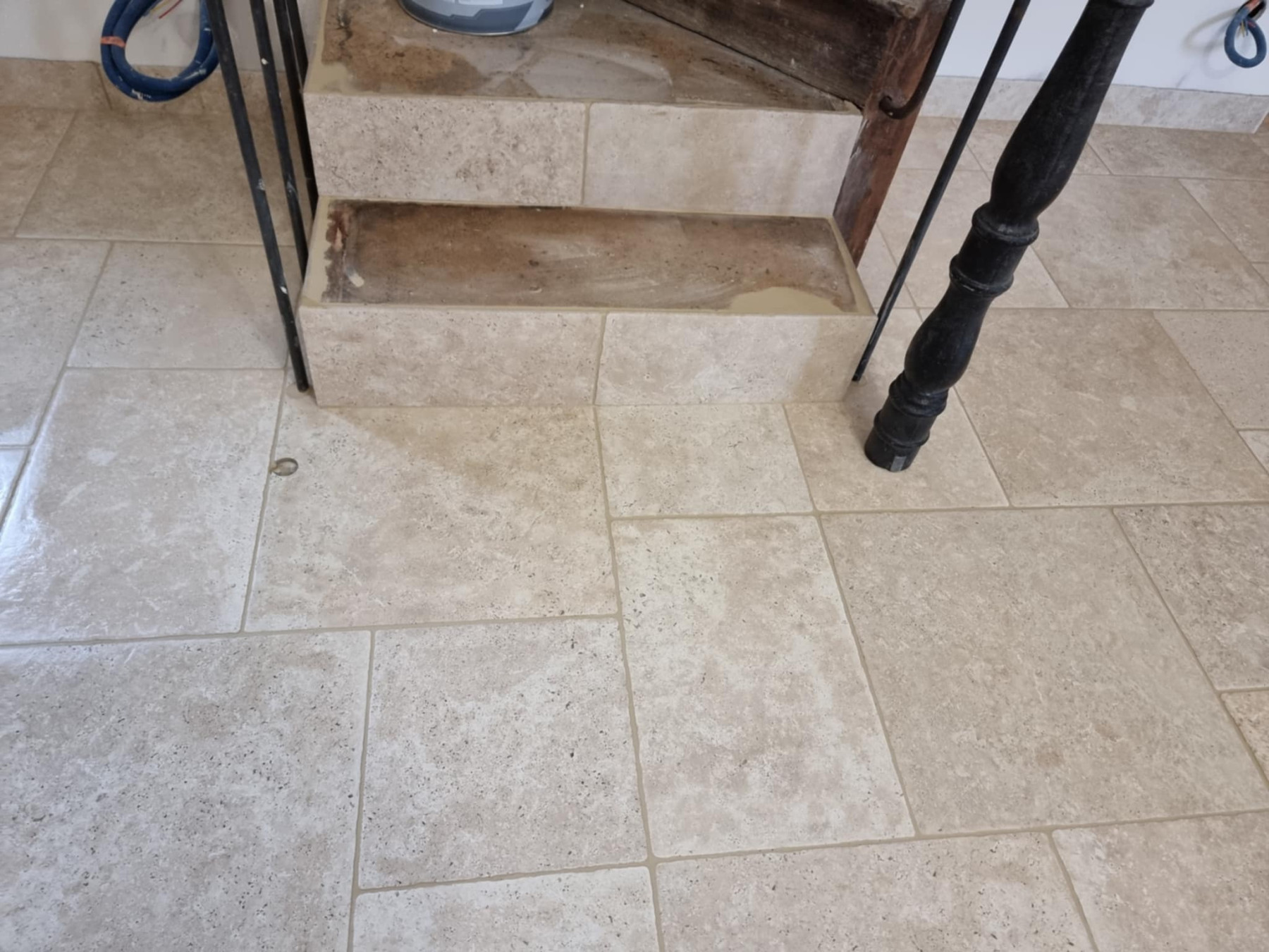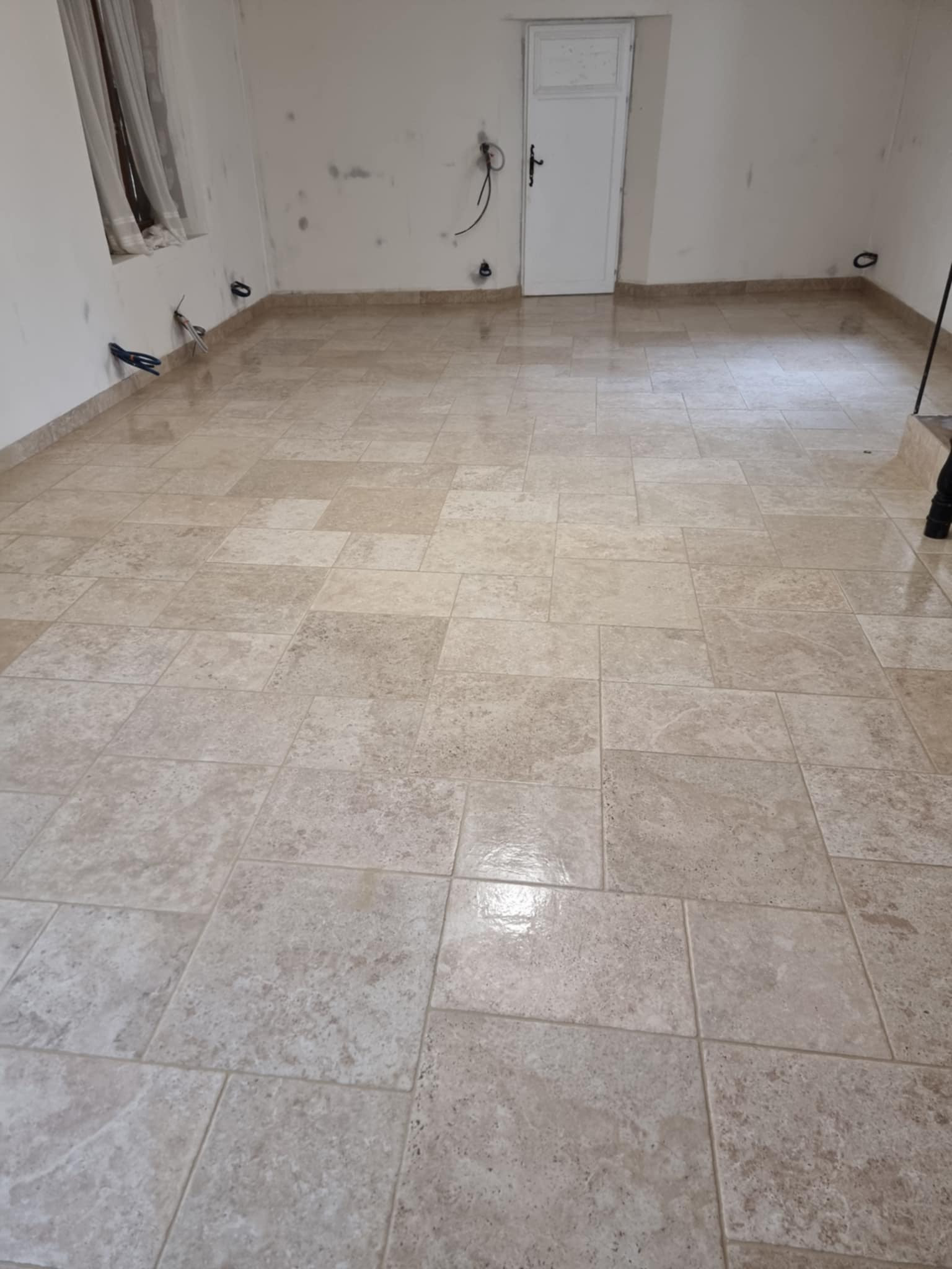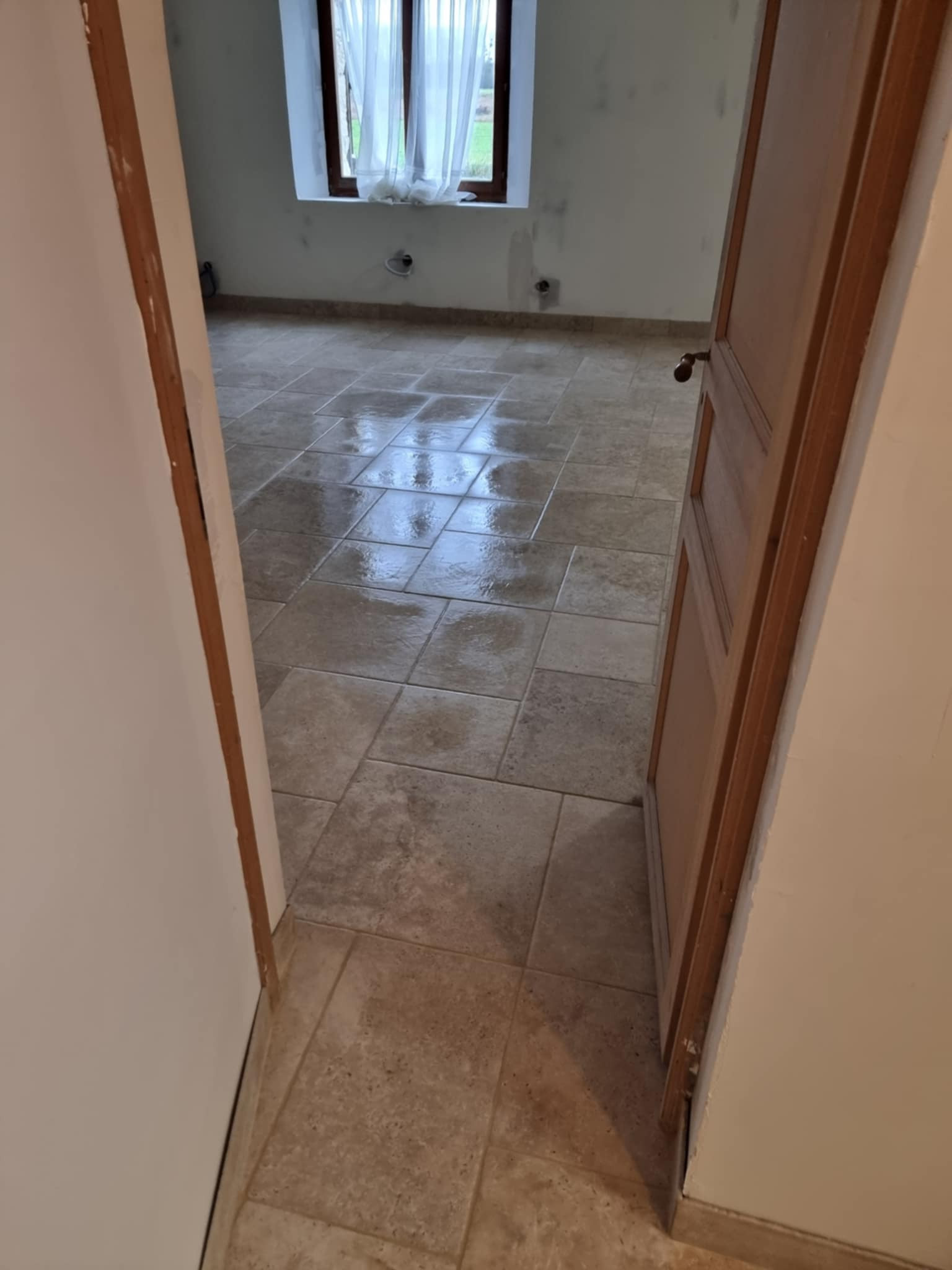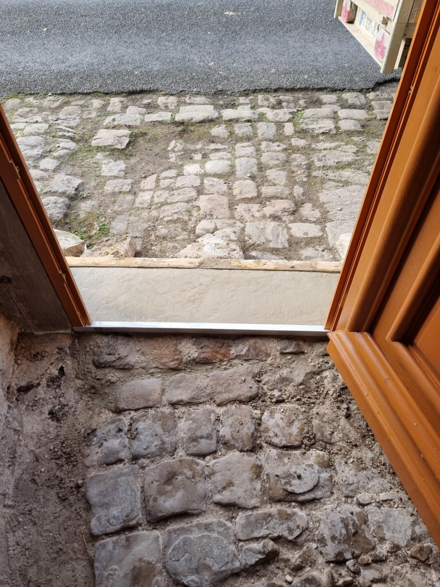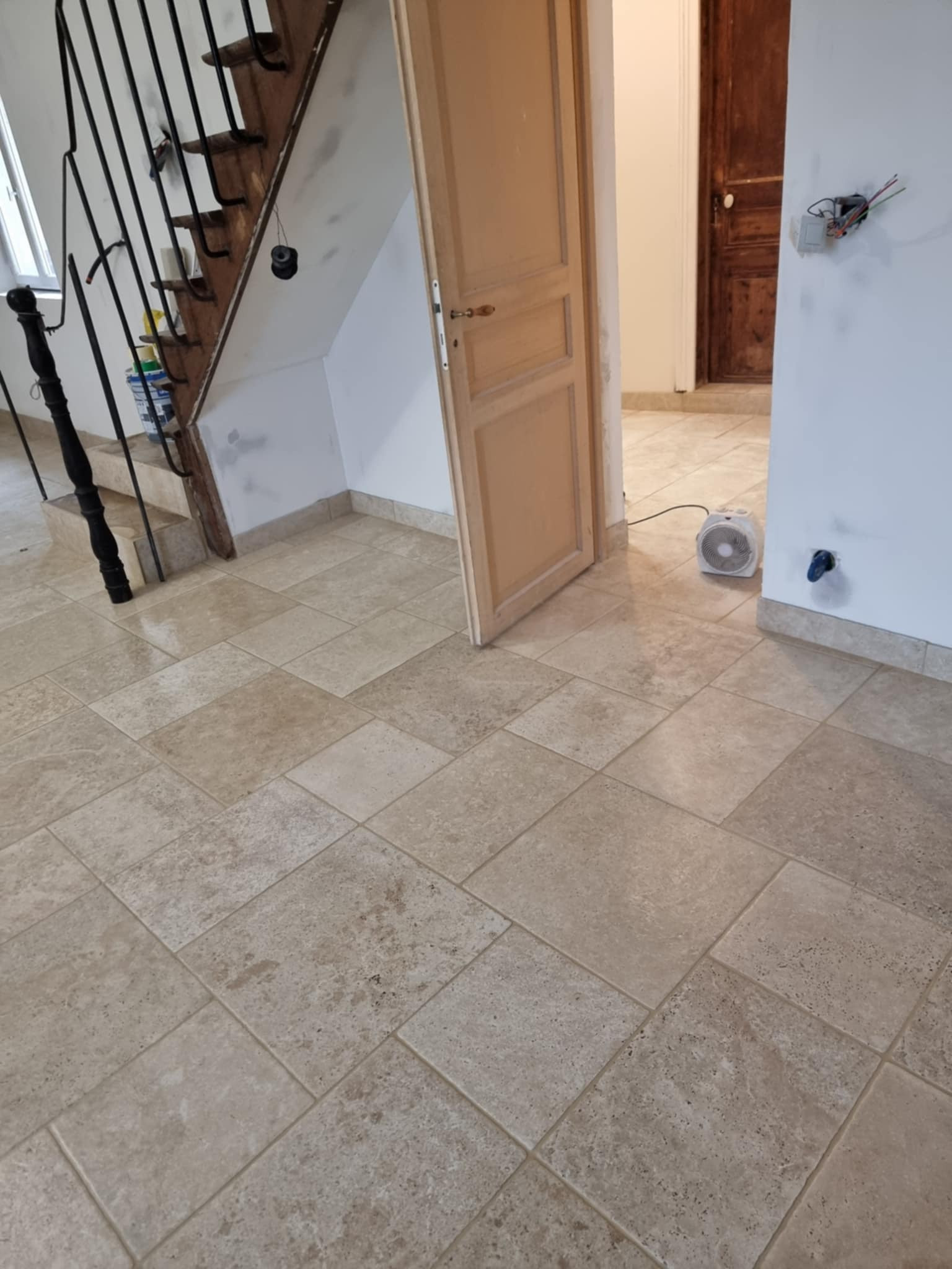 Remplacement d'une porte d'accès avec un seuil coffré, coulé en béton fait main, placo intérieur et pose intégrale de carrelage de sol en multi formats imitation travertin avec les plinthes.