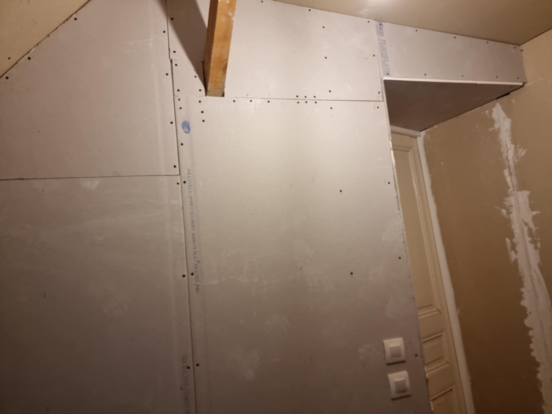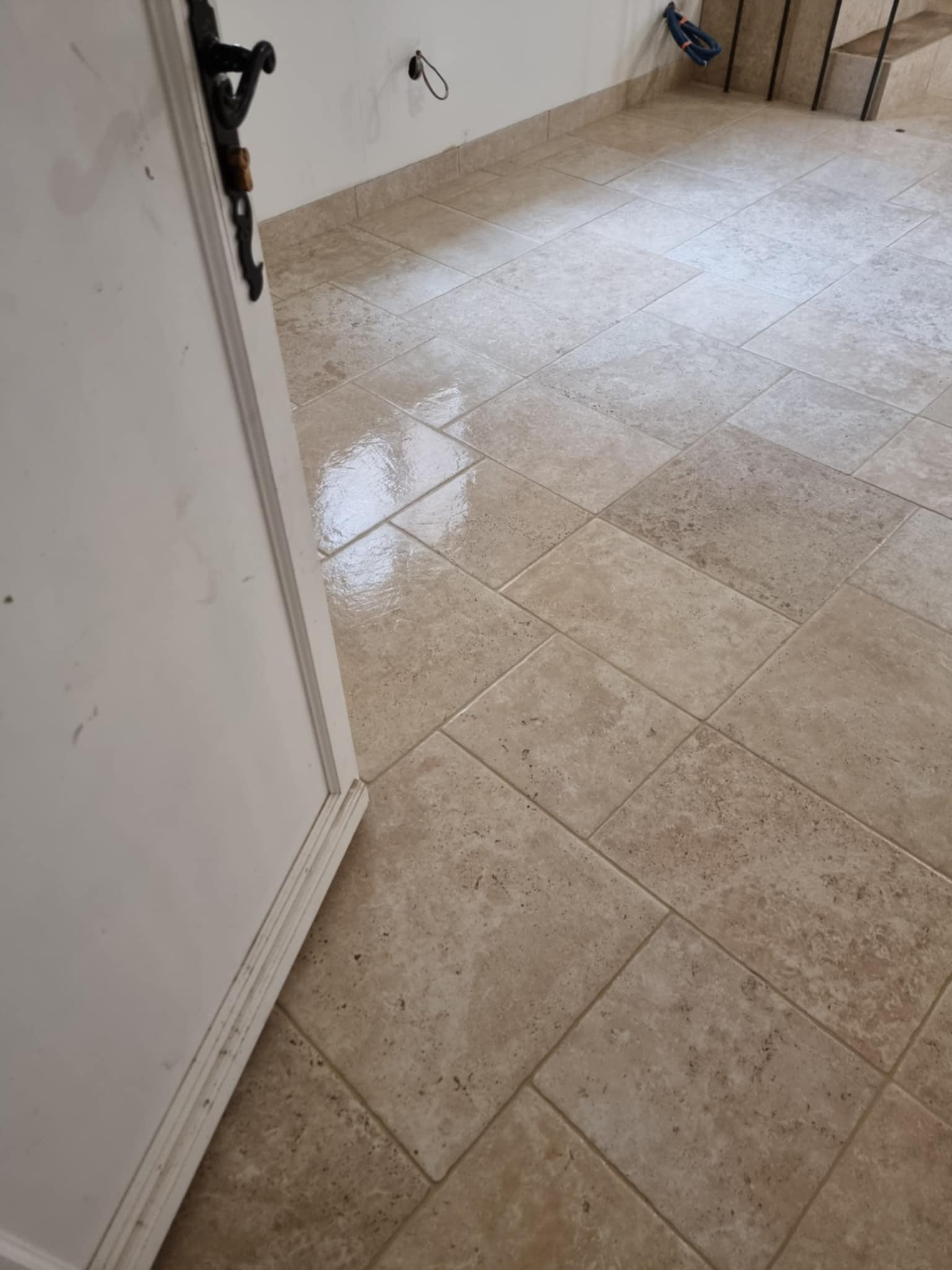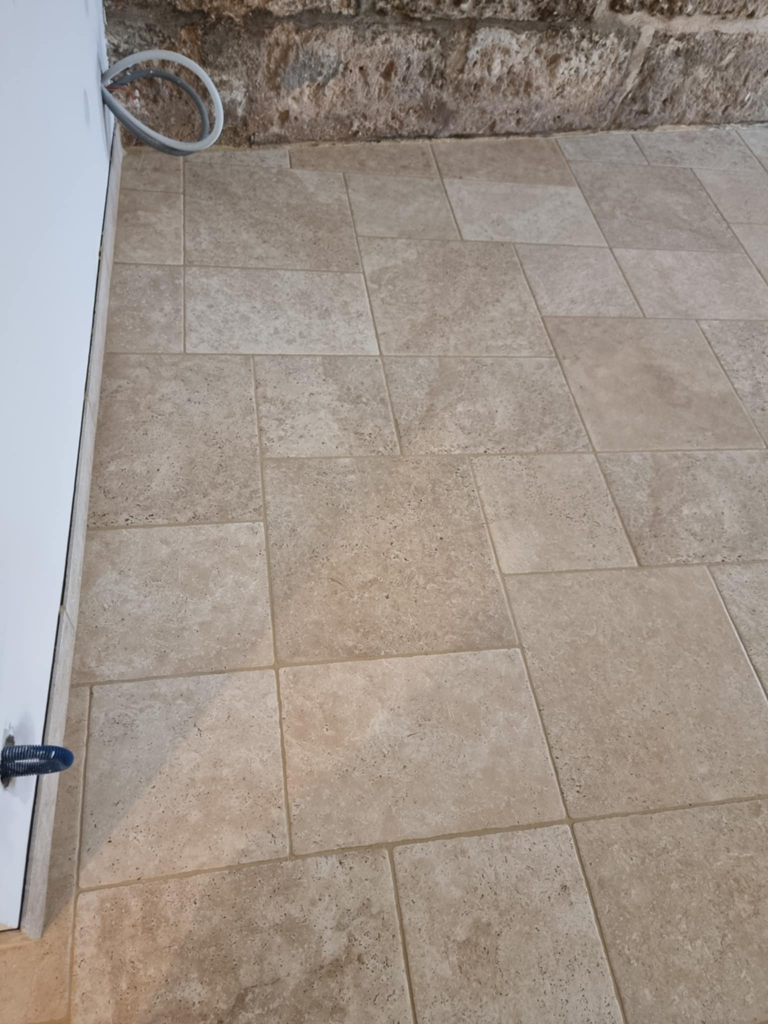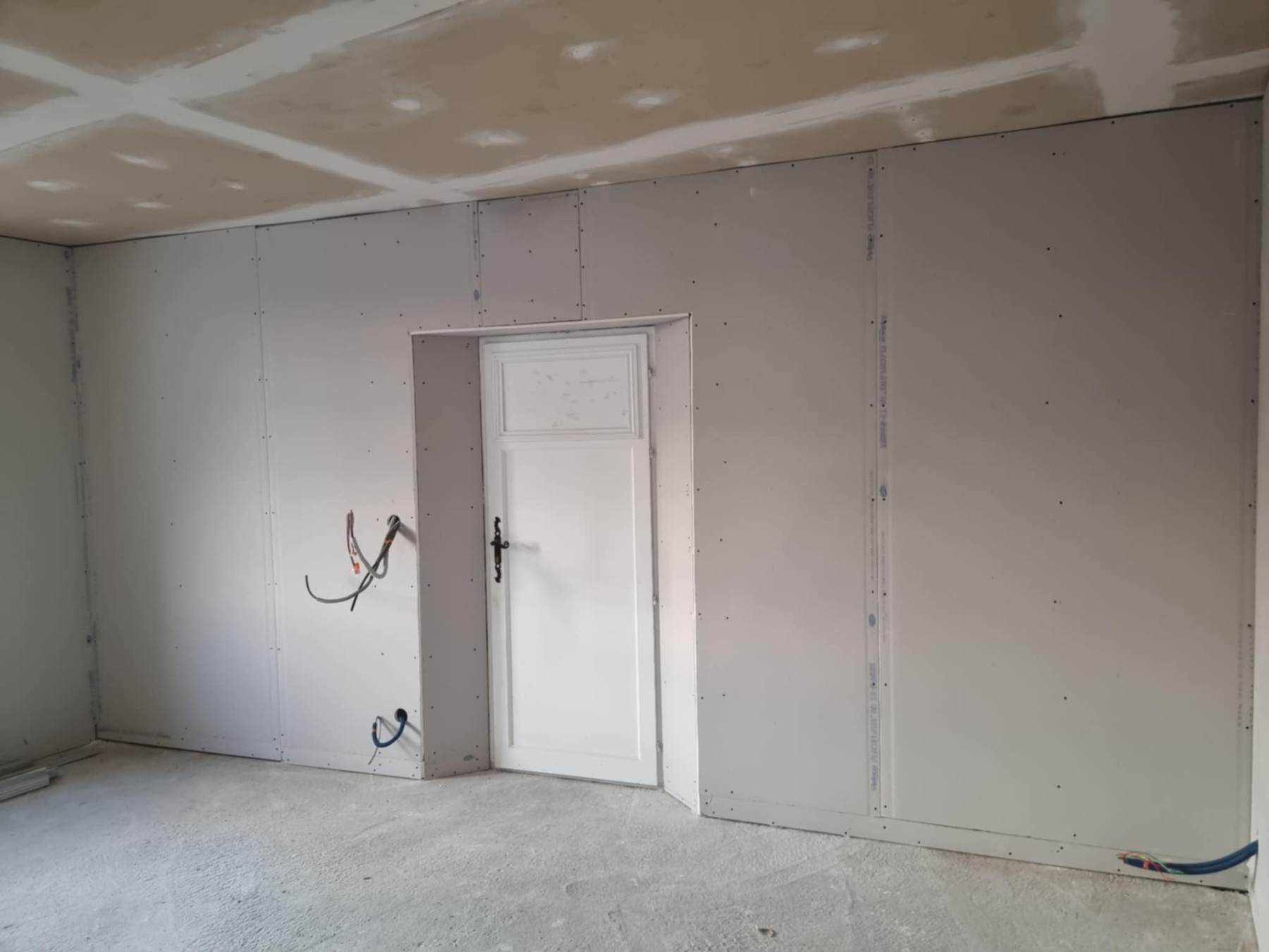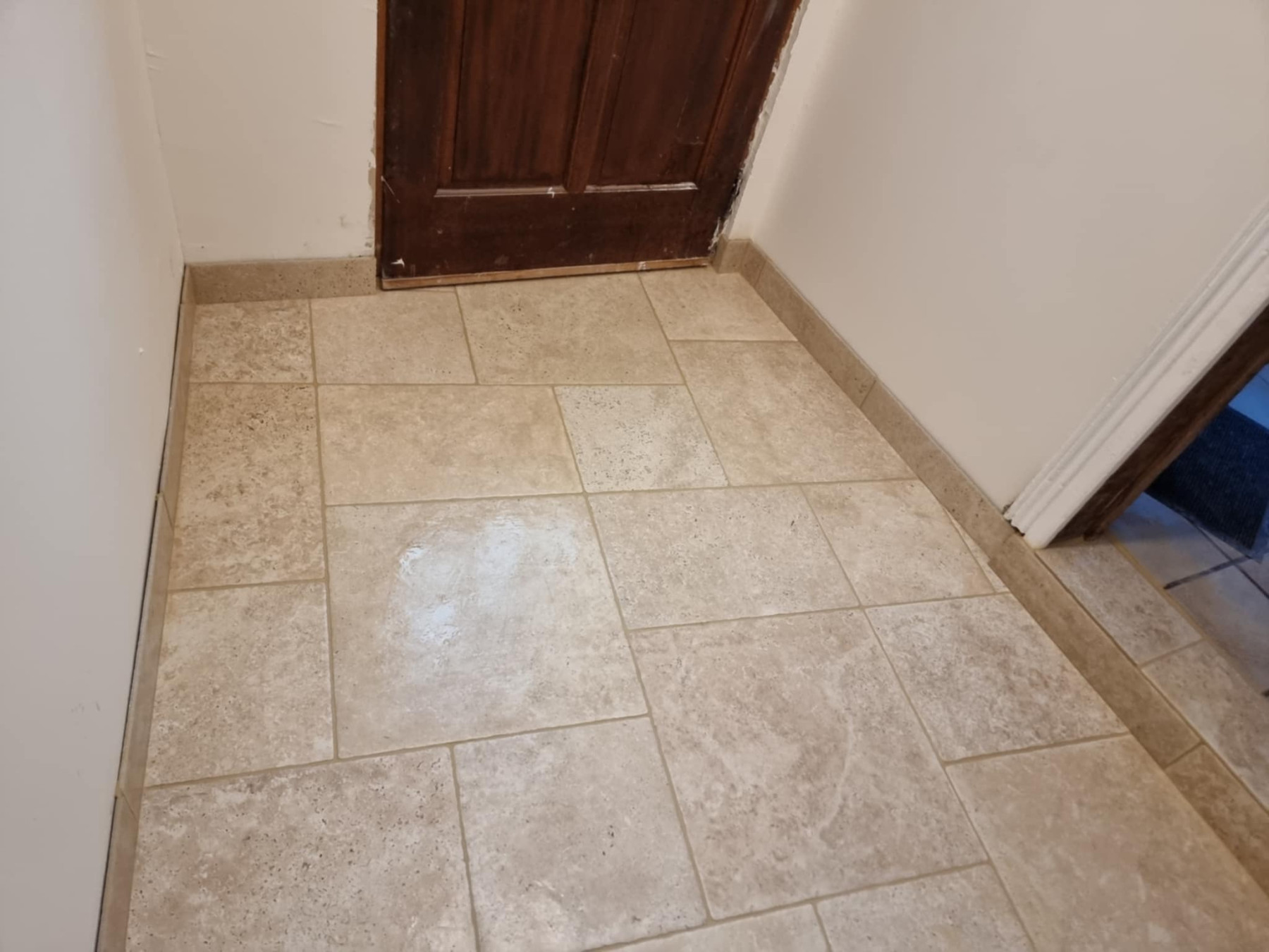 Remplacement d'une porte d'accès avec un seuil coffré, coulé en béton fait main, placo intérieur et pose intégrale de carrelage de sol en multi formats imitation travertin avec les plinthes.